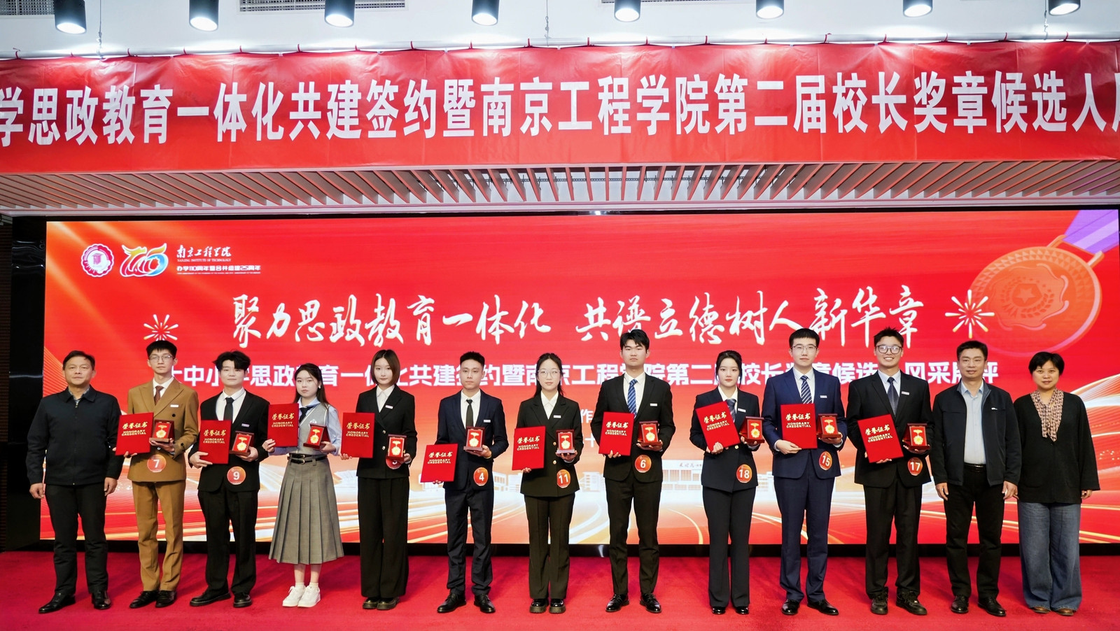 在随后举行的第二届“校长奖章”风采展评中,18名候选人依次登台,从思想品德、科研创新、社会服务等多方面展示青春风采。经纸质材料评审与现场展评综合评分,机械工程学院李孟宸等10名同学荣获该奖章,与会领导为获奖者颁发奖章与证书。