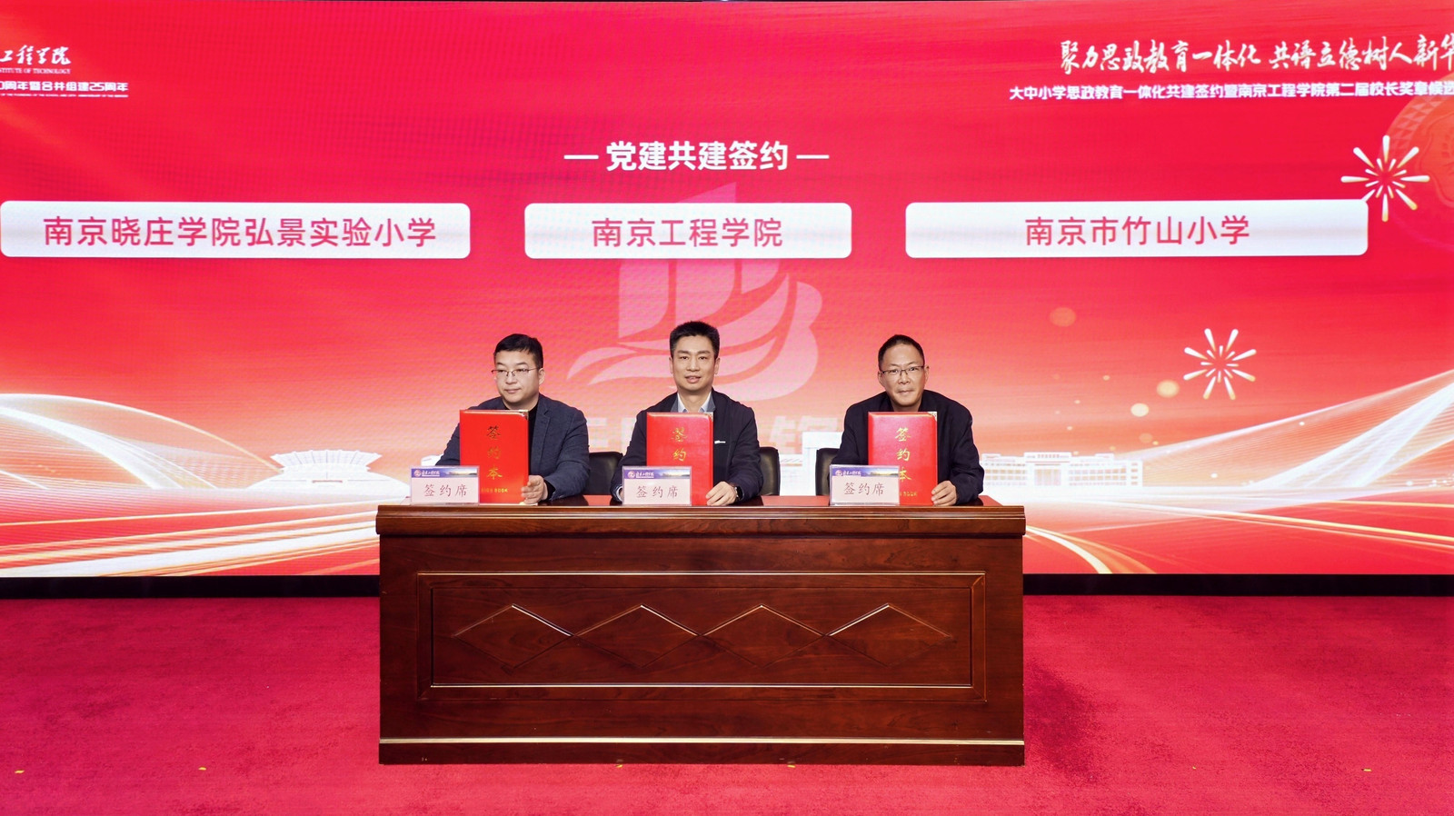 在与会人员的共同见证下,学校与南京市竹山小学、南京晓庄学院弘景实验小学签订党建共建协议书,并与江宁高级中学等三所学校共同为“大中小学思政课一体化建设教育研究实践基地”揭牌。