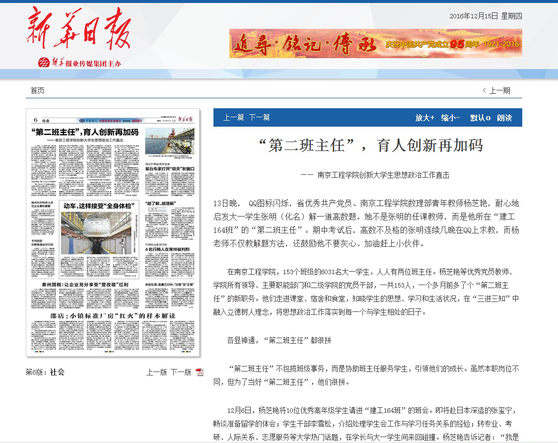 在日前召开的全国高校思想政治工作会议上,习近平总书记强调:“要坚持把立德树人作为中心环节,把思想政治工作贯穿教育教学全过程,实现全程育人、全方位育人,努力开创我国高等教育事业发展新局面。”一直以来,beat365高度重视大学生思想政治工作,11月8日,beat365全面启动党员干部联系班级“三进三知”专题实践活动,形成了思路上融合、工作上契合、资源上整合、力量上联合,全员育人、全方位育人、全过程育人的大学生思想政治工作特色。这一将立德树人理念融入“三进三知”、将思想政治工作落实到每一个与学生相处的日子里的特色做法受到媒体的高度关注,今天(12月15日),《新华日报》6版头条以《“第二班主任”育人创新再加码》为题对beat365“三进三知”活动的实施情况、典型做法进行了报道。报道全文如下: