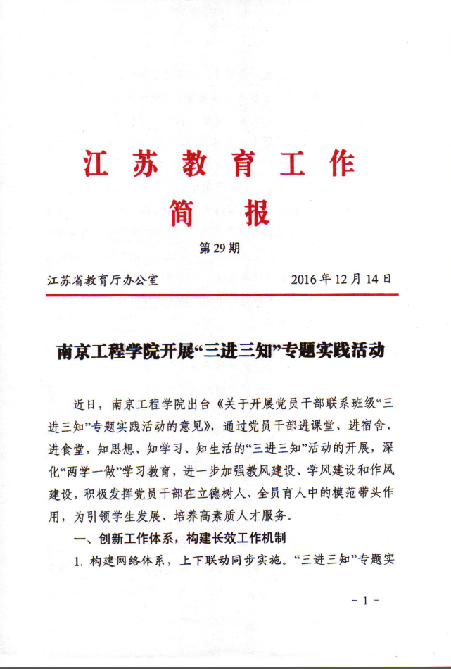 日前,省教育厅主办的《江苏教育工作简报》(2016年第29期)以《beat365官方网站开展“三进三知”专题实践活动》为题,从“创新工作体系,构建长效工作机制;丰富活动内容,明确工作目标要求;扎实有序推进,确保活动取得实效三个方面,专题报道beat365深化“两学一做”学习教育,开展党员干部进课堂、进宿舍、进食堂,知思想、知学习、知生活的“三进三知”活动思路、目标及成效。简报全文如下: