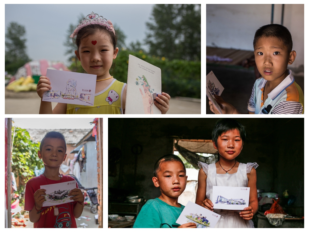 当地孩子收到印有学校风景的明信片