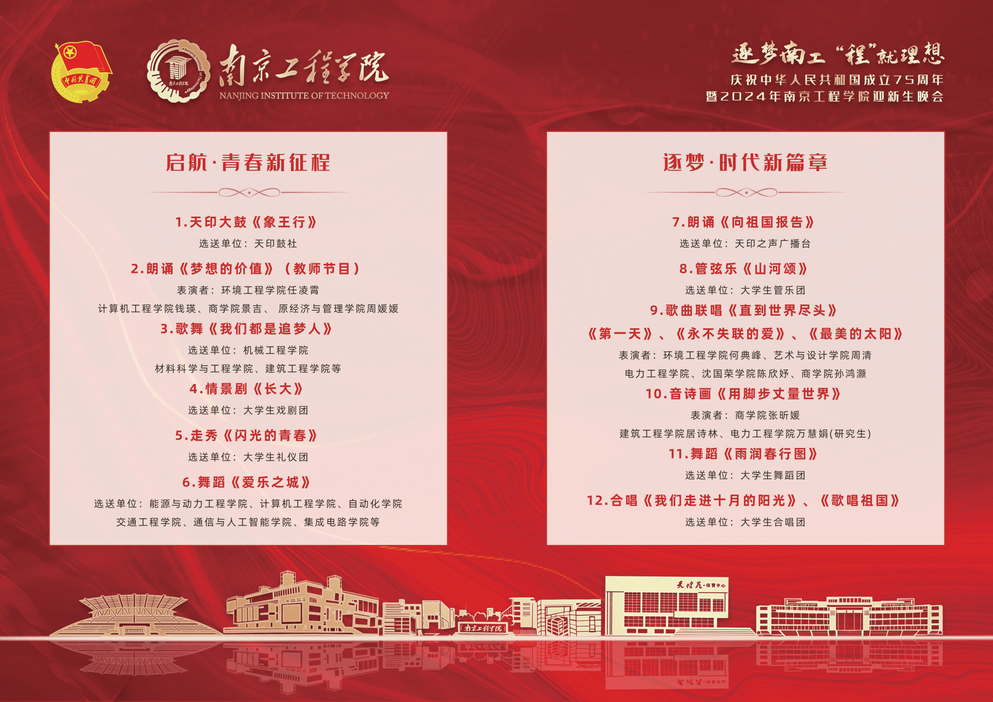 为庆祝祖国75周年华诞,迎接学校2024级新生,增强广大师生爱党爱国爱校热情,展现beat365青年学子砥砺前行、矢志登峰的昂扬精神面貌,营造健康向上的校园文化氛围,决定举办“逐梦南工 ‘程’就理想”庆祝中华人民共和国成立75周年暨2024年南京工程学院迎新生晚会,现将有关事宜通知如下: