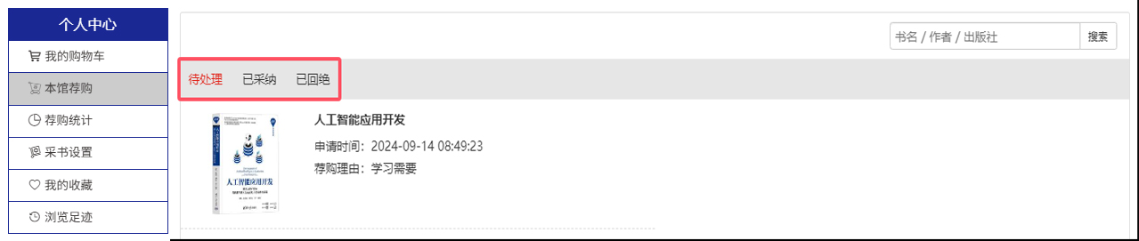 4.我的荐购:【个人中心】→【我的荐购】中可查看到所有的荐购书目,及图书馆的采纳情况。