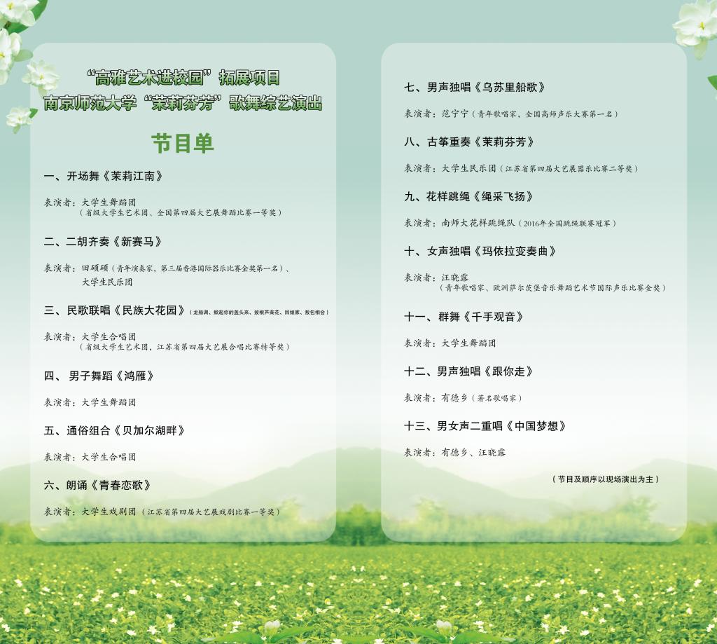 本次“高雅艺术进校园”是由南京师范大学大学生艺术教育中心给我们带来的“茉莉芬芳”歌舞综艺演出。演出本着“高水平、高层次”的宗旨,突出中国民族民间传统文化,以高雅艺术为展现形式,选取中国优秀艺术领域的经典作品,汇集了南京师范大学多年来艺术教育的优秀成果和艺术团历年在全国、全省获奖的经典节目,是一场集专业性、民族性、校园性于一体的文艺演出。本场演出,以中华民族音乐舞蹈为主线,既有流芳百世的艺苑精粹,又有充满青春气息和时代精神的佳品力作。晚会的表演形式丰富而多样,包括声乐、舞蹈、器乐、朗诵等,能充分满足观众的视听感受和对舞台美的欣赏需求。晚会的演员阵容强大,作为本次综艺演出的艺术指导均为在我省艺术表演领域中享有较高声誉的专家,他们分别为著名男高音歌唱家有德乡教授、著名二胡表演艺术家召唤老师、著名舞蹈编导李凯伟老师。参加演出的演员包括知名艺术家、南京师范大学艺术类专业教师、艺术团的指导教师以及获得过省内外重大奖项的学生演员和艺术特长生。晚会的部分节目已在全省各大高校及电视台进行过专场演出,受到了广大师生和观众的一致好评。