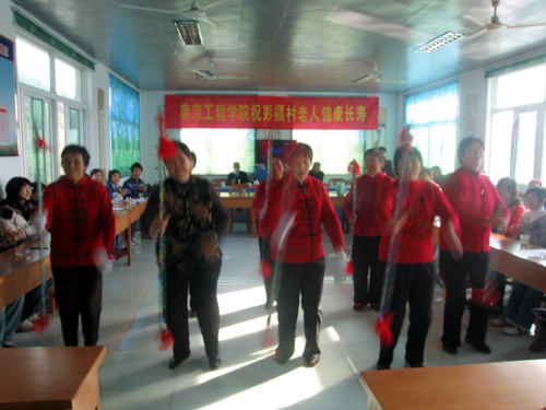 同学们给老人们送去了印有健康长寿的横幅,还准备了精彩的演出和趣味游戏。《北京有个金太阳》的合唱让老人们回想起了峥嵘岁月里的苦辣酸甜;歌曲《感恩的心》表达了学子们对亲人、对师长、对社会的感恩之心和以一颗感恩的心来报答他们的情怀;“赶猪”游戏是同学们根据老年社会工作的相关理论精心准备的趣味游戏,既使老年人的筋骨得到活动,又使他们的精神得到了愉悦。同学们精彩的表现得到了老人们的热烈回应,他们用自编自演的打花拐等节目展示了彭福村老人丰富的精神生活,令同学们耳目一新