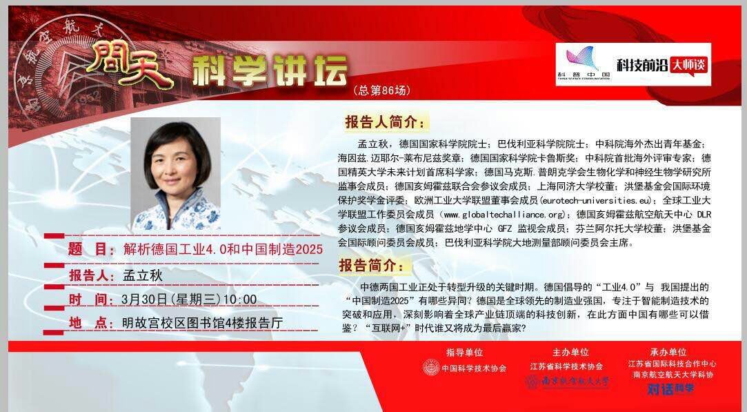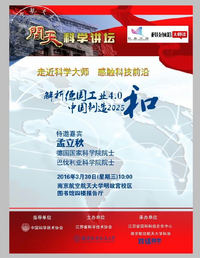 接有关部门通知,3月30日,江苏省科学技术协会邀请德国国家科学院孟立秋院士在南京航空航天大学做“解析德国工业4.0和中国制造2025”报告,感兴趣的师生可以前往参加。
