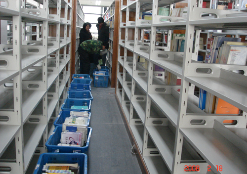 截至日前,搬迁的全部人员已苦战了8天,临时馆、新馆内均呈现出一片紧张有序的繁忙景象(如图)。同时,新图书馆楼内环境布置和美化工作也开始紧锣密鼓地进行,目前图书馆还在积极与其他部门协调图书馆网络系统、门禁系统的安装以及新购之办公家具、设备的到位工作。