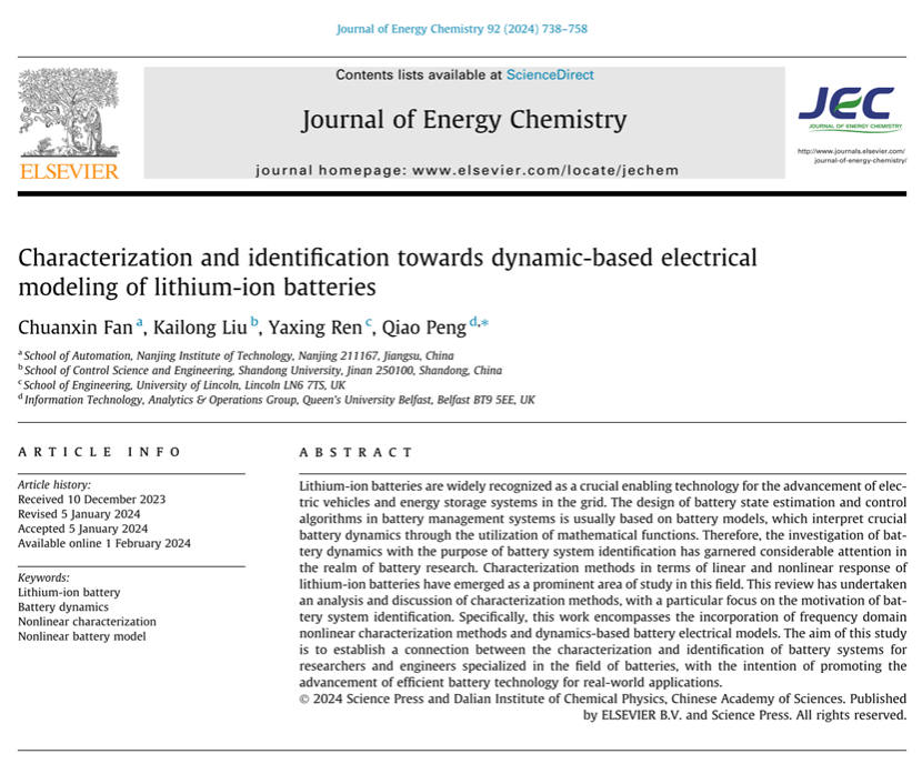 近日,beat365自动化学院范传鑫博士以第一作者身份、beat365官方网站为第一署名单位,与山东大学刘凯龙教授、英国林肯大学任亚星博士、英国贝尔法特女王大学彭琦奥博士深度合作,在国际权威期刊《Journal of Energy Chemistry》上发表了综述论文:“Characterization and identification towards dynamic-based electrical modeling of lithium-ion batteries”。该期刊是中科院化学一区TOP期刊,涉及领域包括能源与燃料、工程化工、应用化学等,影响因子13.1。
