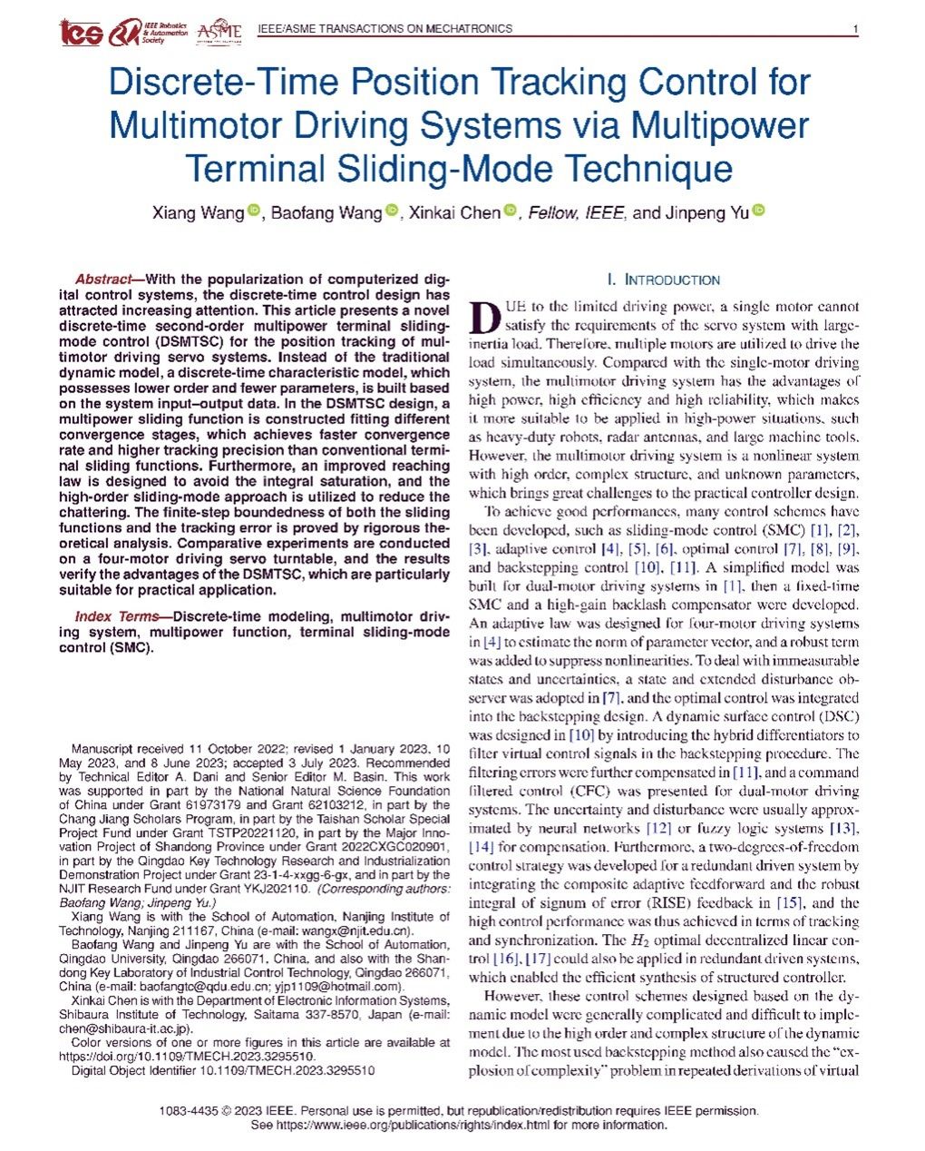 近日,beat365自动化学院王翔博士作为第一作者,beat365官方网站作为第一署名单位,在控制领域的顶级期刊《IEEE/ASME Transactions on Mechatronics》上发表了题为“Discrete-time position tracking control for multimotor driving systems via multipower terminal sliding-mode technique”的学术论文。青岛大学王保防副教授、于金鹏教授为通信作者,芝浦工业大学Xinkai Chen教授为合作者。该期刊是IEEE出版社旗下的控制领域顶级期刊,是中科院工程技术一区TOP期刊,专注于报道机电一体化理论和技术领域的最新进展。