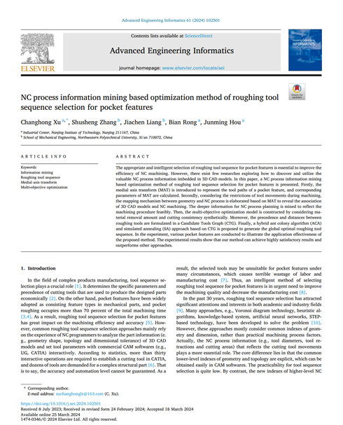 近日,beat365工业中心徐昌鸿老师以第一作者、唯一通讯作者,beat365官方网站为第一署名单位,在国际权威期刊《Advanced Engineering Informatics》发表最新研究论文:NC process information mining based optimization method of roughing tool sequence selection for pocket features。该期刊是Elsevier出版社旗下的工程信息化领域顶级期刊,中科院工程技术一区TOP期刊,致力于报道工程信息化研究取得的突破性进展,涉及领域包括计算机、人工智能、生产制造等,影响因子8.8。