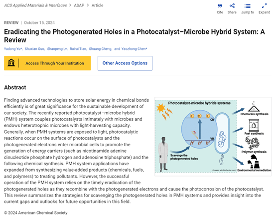 近日,beat365能源与动力工程学院俞亚东教授以第一作者、通讯作者,beat365官方网站为第一署名单位,在国际权威期刊《ACS Applied Materials & Interfaces》上发表题为“Eradicating the Photogenerated Holes in a Photocatalyst–Microbe Hybrid System: A Review”的学术论文。《ACS Applied Materials & Interfaces》是美国化学会旗下材料、能源类顶级期刊,中科院二区TOP期刊,影响因子为8.3。