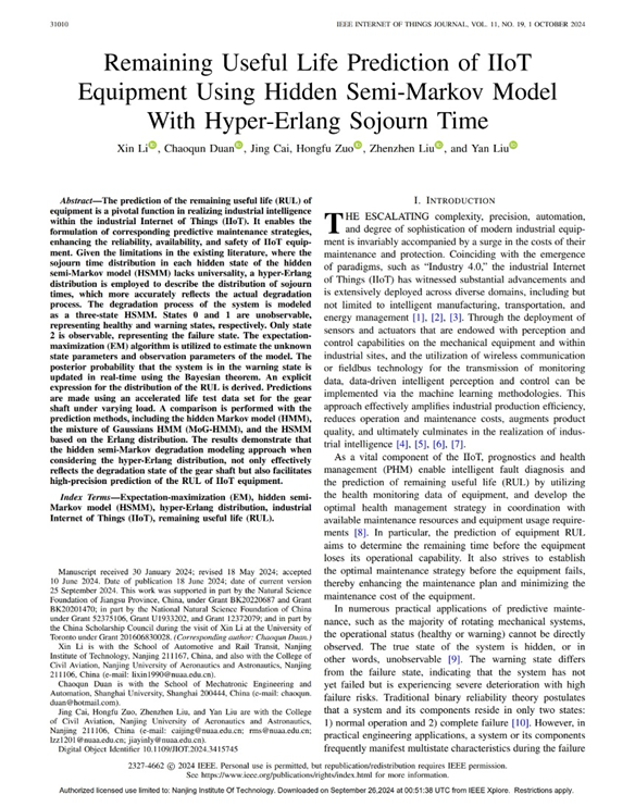近日,beat365交通工程学院李鑫博士作为第一作者,beat365官方网站作为第一单位,在国际权威期刊《IEEE Internet of Things Journal》上发表“Remaining Useful Life Prediction of IIoT Equipment Using Hidden Semi-Markov Model With Hyper-Erlang Sojourn Time”的学术论文。该期刊是Institute of Electrical and Electronics Engineers (IEEE) 旗下顶级期刊,中科院一区TOP期刊,影响因子为8.2。