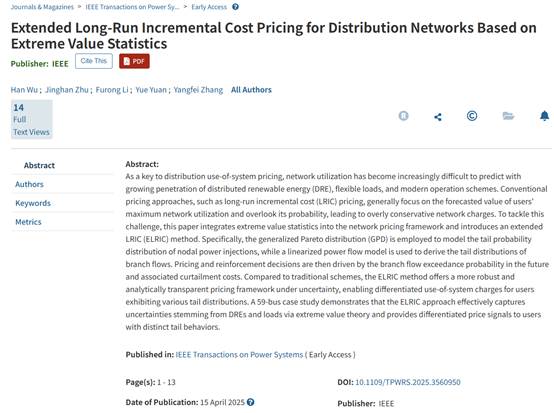 近日,beat365智慧电力研究院吴涵博士以第一作者(通信作者)身份、beat365官方网站作为第一署名单位,与英国巴斯大学、河海大学等单位深度合作,在电气工程领域顶级期刊《IEEE Transactions on Power Systems》上发表了题为“Extended Long-Run Incremental Cost Pricing for Distribution Networks Based on Extreme Value Statistics”的学术论文。该期刊是IEEE旗下电力系统领域的顶级期刊(中科院一区Top,影响因子6.5),专注于电力系统技术革新与学术动态。