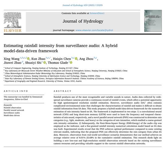 王兴博士在《Journal of Hydrology》发表题为“Estimating rainfall intensity from surveillance audio: A hybrid model-data-driven framework”的论文,聚焦城市气象感知新途径,提出融合物理模型与深度学习的音频降雨估测框架,利用城市监控音频数据实现降雨强度的精准估算,为提升城市降雨监测精度、辅助防灾减灾决策提供了有效路径。
