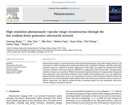 张雅檬博士联合南京航空航天大学、英国伯明翰大学,在国际期刊《Photoacoustics》发表题为“High resolution photoacoustic vascular image reconstruction through the fast residual dense generative adversarial network”的论文。研究提出了一种快速残差密集生成对抗网络(FRDGAN),集成残差密集模块与深度可分离卷积技术,显著提升光声显微图像重建速度与质量。通过在小鼠活体脑血管、猪肝组织和微流控芯片等实验场景中的系统验证,该方法在生物医学图像重建方面展现出良好应用前景。