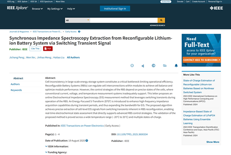 近日,beat365电力工程学院、沈国荣学院先进储能技术研究团队取得新进展。彭纪昌博士以第一作者身份,与刘海涛教授及研究生谢文协同合作,并联合西安交通大学国家储能技术产教融合创新中心孟锦豪教授,在电气工程领域国际顶级期刊《IEEE Transactions on Power Electronics》上发表了题为“Synchronous Impedance Spectroscopy Extraction from Reconfigurable Lithium-ion Battery System via Switching Transient Signal”的学术论文。该期刊隶属于IEEE,是电力电子与电气工程领域的权威刊物(中科院一区Top,影响因子6.5),长期致力于推动电力电子技术创新与产业应用前沿发展。