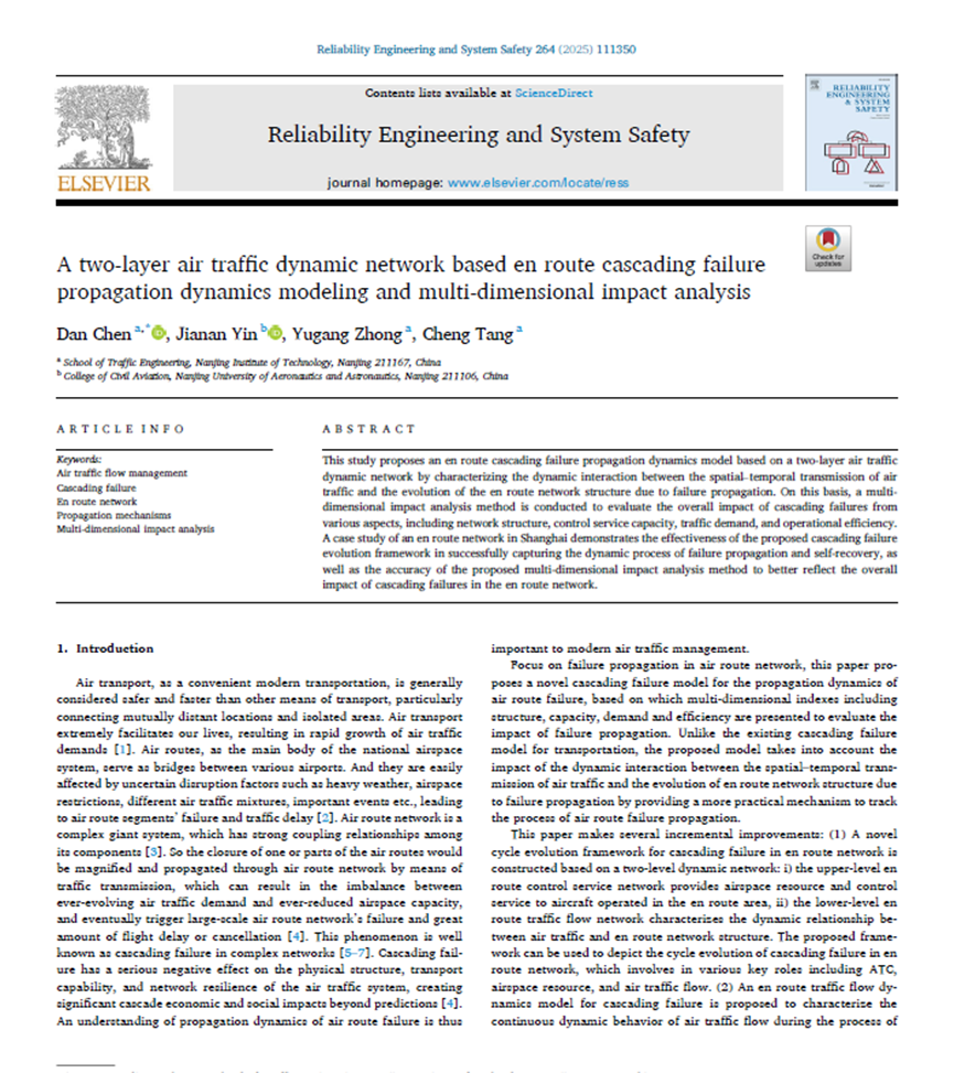 近日,beat365交通工程学院陈丹副教授以第一作者、通讯作者身份,beat365官方网站作为第一单位,联合南京航空航天大学,在国际权威期刊《Reliability Engineering and System Safety》上发表了题为“A two-layer air traffic dynamic network based en route cascading failure propagation dynamics modeling and multi-dimensional impact analysis”的学术论文。该期刊是Elsevier旗下工程技术类顶级期刊,是中科院工程技术一区TOP期刊,致力于研究可靠性工程和系统安全,影响因子11。
