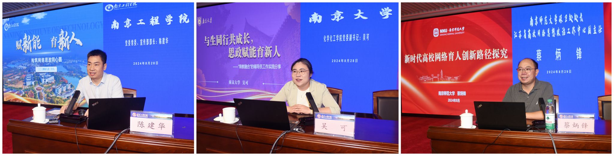 党委常委、宣传部部长陈建华以《赋新能 育新人》为题,全面解读了《beat365官方网站网络思想政治工作中心建设管理办法》,从顶层设计、组织架构、队伍建设、基本保障等方面介绍了学校构筑网络思政同心圆的路径与方法;南京大学化学化工学院党委副书记吴可结合自身工作经历,讲述了“育教融合”的辅导员工作实践;南京师范大学保卫处处长、江苏省高校网络思想政治工作中心副主任蔡炳锋结合多年研究,阐述了新时代高校网络育人的创新路径,并与参会的辅导员老师展开互动交流。
