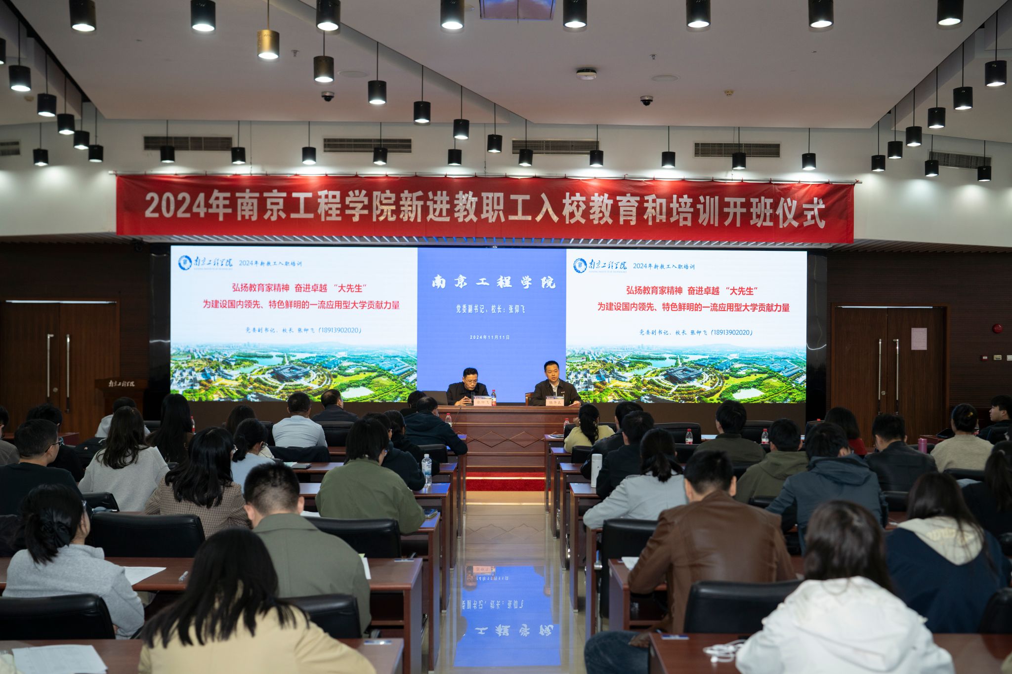 为深入贯彻党的二十届三中全会精神和习近平总书记关于教育的重要论述,引导和促进新教工深刻领会教育家精神,帮助新教工扣好职业生涯的“第一粒扣子”,11月11日,学校举行2024年新进教职工入职教育与培训开班仪式。在校校领导,相关职能部门、学院负责人以及全体新进教职工参加开班式。党委书记孙爱武为开班仪式致辞,党委副书记、校长张仰飞为新进教职工讲授“入职第一课”,活动由党委常委、副校长陆华良主持。