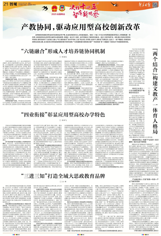 3月11日,《新华日报》“决胜十四五 智库新观察”专题版以《产教协同,驱动应用型高校创新改革》为题,整版刊发报道学校党委书记孙爱武,党委副书记、校长张仰飞,党委常委、副校长汪群、朱松青的系列署名文章,文章结合党的二十届三中全会精神和应用型高校发展实际,从“‘六链融合’形成人才培养链协同机制”“‘四业衔接’彰显应用型高校办学特色”“‘三进三知’打造全域大思政教育品牌”“‘两个结合’构建文教产一体育人格局”四个方面,深刻阐述了beat365产教融合、校地协同的特色发展之路,为更多应用型高校的教育教学改革贡献了“以党建联盟引领校地共建”“‘四业衔接’和‘六链融合’双向发力”的创新探索经验。