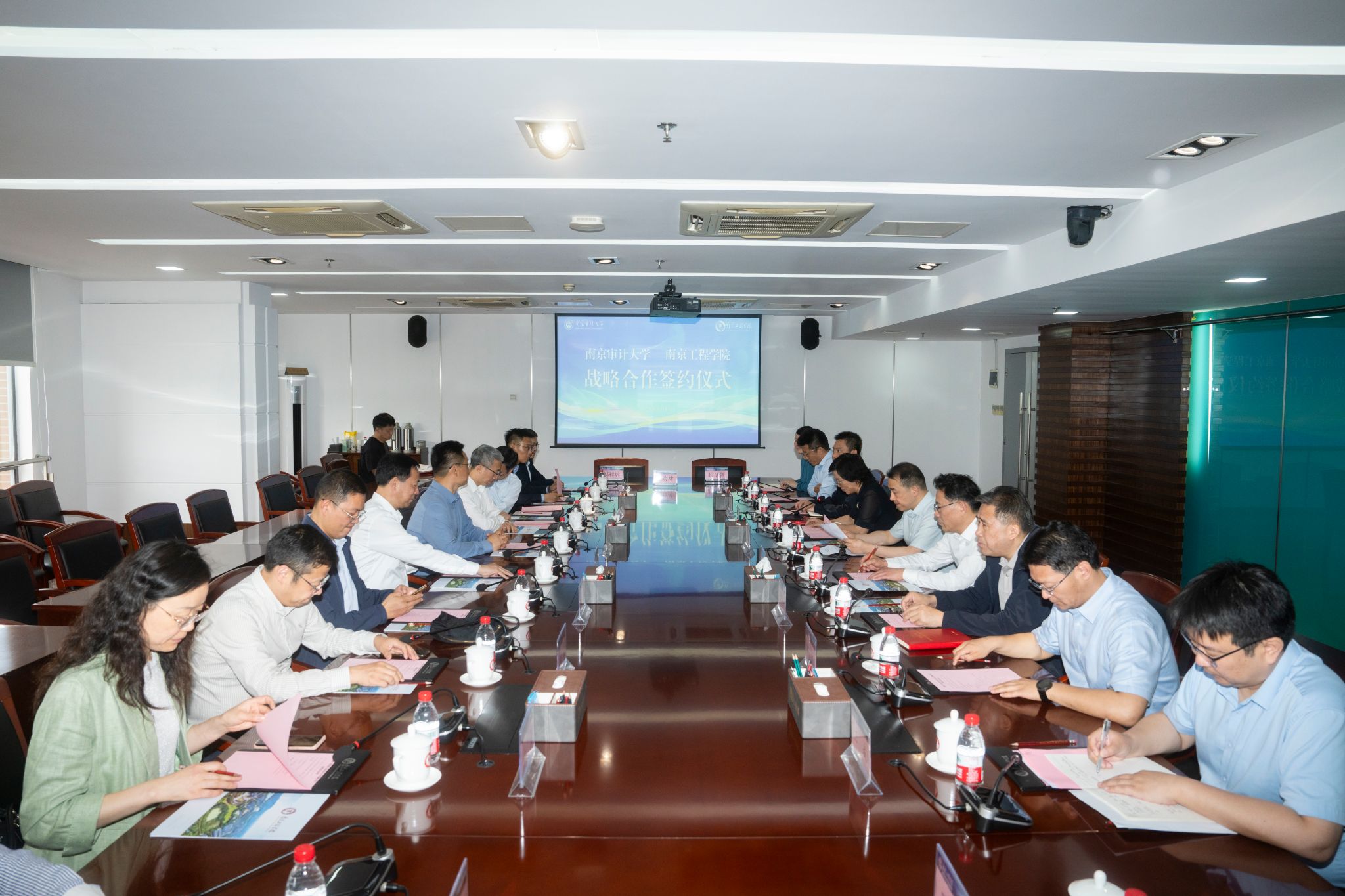 孙爱武代表学校对董必荣一行的到访表示热烈欢迎。他回顾了学校百年办学历程,深厚工科底蕴以及鲜明应用特色,着重介绍了以“一张网”“一度电”“一台床”“一扇门”为代表的特色学科集群,以及学校在应用型人才培养方面的显著优势。孙爱武指出,此次合作不仅是校际资源的深度整合,更是南工程“实业报国”与南审“文化强国”战略的强强联合。希望以此次签约为契机,在人才培养创新、学科交叉融合、国奖培育申报等领域开展项目化合作,为区域经济社会发展输送更多“强基础、重实践、求创新、高素质”的复合型人才。