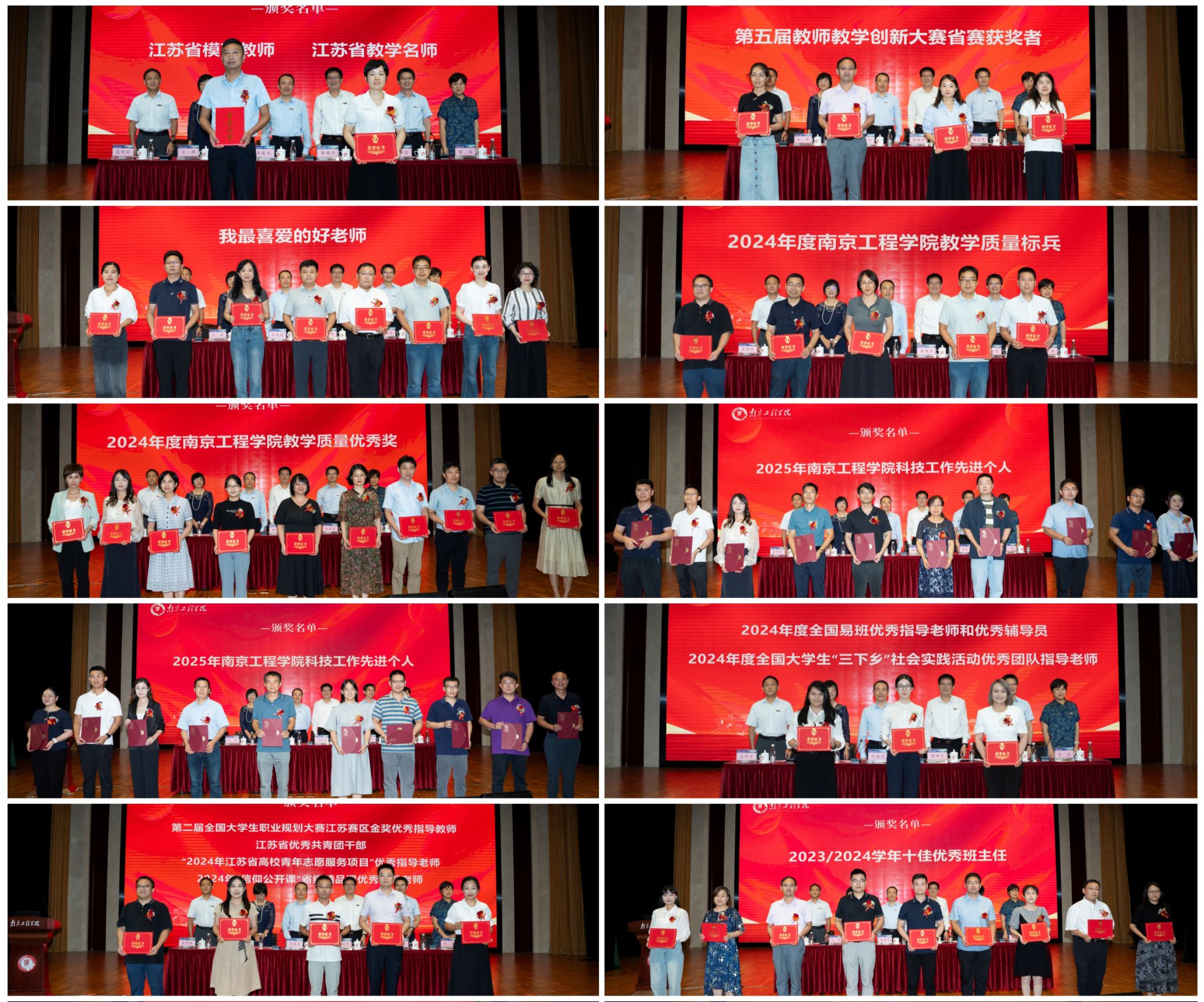 在热烈的掌声中,校领导向一年来在党建思政、教书育人、科技创新等领域取得优异成绩的教师代表颁发证书。他们中既有爱岗敬业、深受学生喜爱的“模范教师”以及凭借卓越教学能力在各类大赛中斩获佳绩的“教学名师”;又有长期深耕教学一线,以精益求精的态度打磨教学工作的“教学质量标兵”以及在科技领域积极探索、成果丰硕的“科技工作先进个人”;还有默默陪伴学生成长、为学生青春赋能的优秀辅导员、班主任以及共青团干部。
