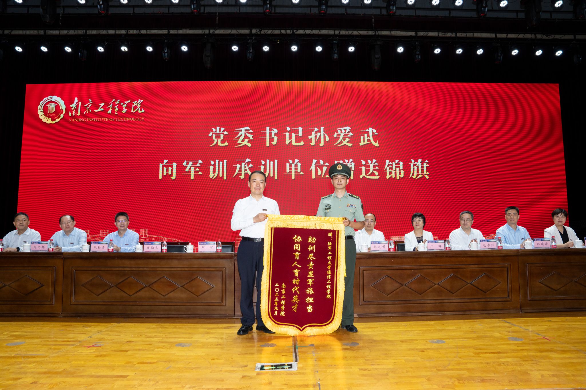 在热烈的掌声中,党委书记孙爱武代表学校向军训承训单位赠送锦旗,对承担本次军训任务的全体教官以及各学院辛勤付出的老师们表示衷心感谢。中国人民解放军陆军工程大学通信工程学院学员三大队大队长胡宁上校代表承训单位接受锦旗。活动还对军训工作中取得优异成绩的先进集体和个人进行表彰,党委常委、副校长陈建华宣读《关于表彰2025级学生军事技能训练先进集体和先进个人的决定》。