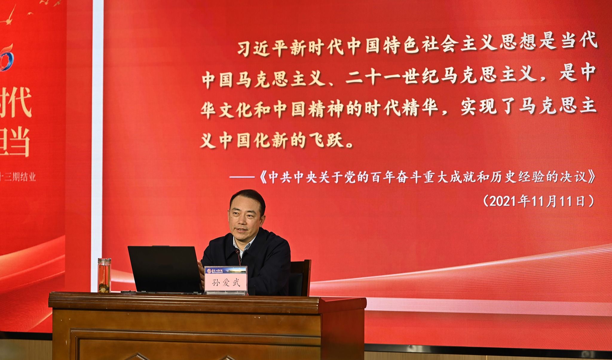 孙爱武为第十四期“青马班”授旗,并以“马克思主义中国化时代化新的飞跃”为主题为参训学员讲授思政课。他围绕习近平新时代中国特色社会主义思想的创立背景、主要内容和科学体系、历史地位等内容,结合优秀校友成长成才的青春故事,勉励大学生将个人成长轨迹融入国家发展大局,勇于在科技创新前沿、社会服务一线、基层治理实践中挺膺担当,奋力书写南工程青年的时代风采。