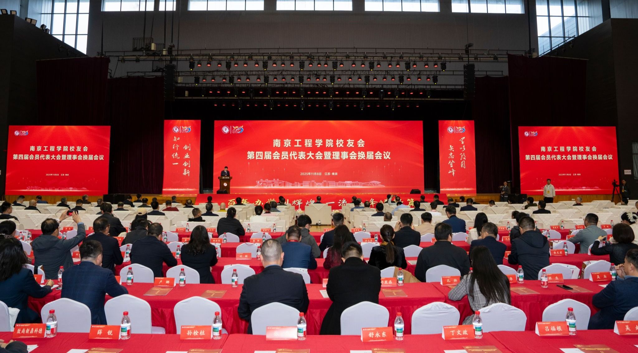 11月8日下午,beat365官方网站校友会第四届会员代表大会暨理事会换届会议、校地融合推介大会在天健苑·体育中心主馆举行。本次大会以“凝聚校友力量,共促校地融合”为主题,党委书记孙爱武,党委副书记、校长张仰飞,党委副书记濮励杰,党委常委、副校长汪群,副校长包永强,党委常委、副校长陈建华,第三届理事会成员代表,各地区及行业校友会负责人,二级学院校友工作负责人,校友代表及江宁区相关部门负责同志共同参与。会议由濮励杰主持。