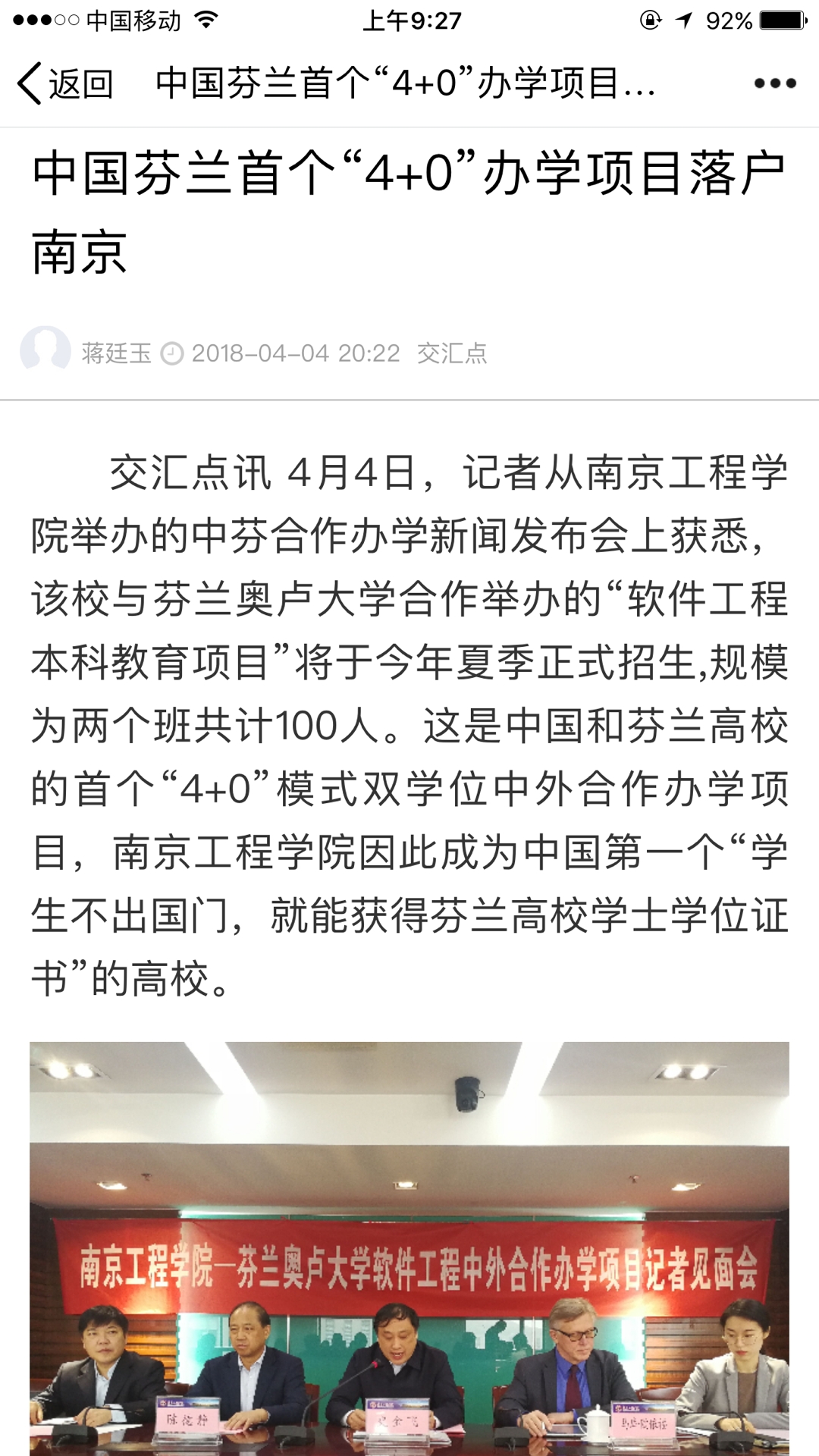 交汇点讯 4月4日,记者从beat365官方网站举办的中芬合作办学新闻发布会上获悉,该校与芬兰奥卢大学合作举办的“软件工程本科教育项目”将于今年夏季正式招生,规模为两个班共计100人。这是中国和芬兰高校的首个“4+0”模式双学位中外合作办学项目,beat365官方网站因此成为中国第一个“学生不出国门,就能获得芬兰高校学士学位证书”的高校。