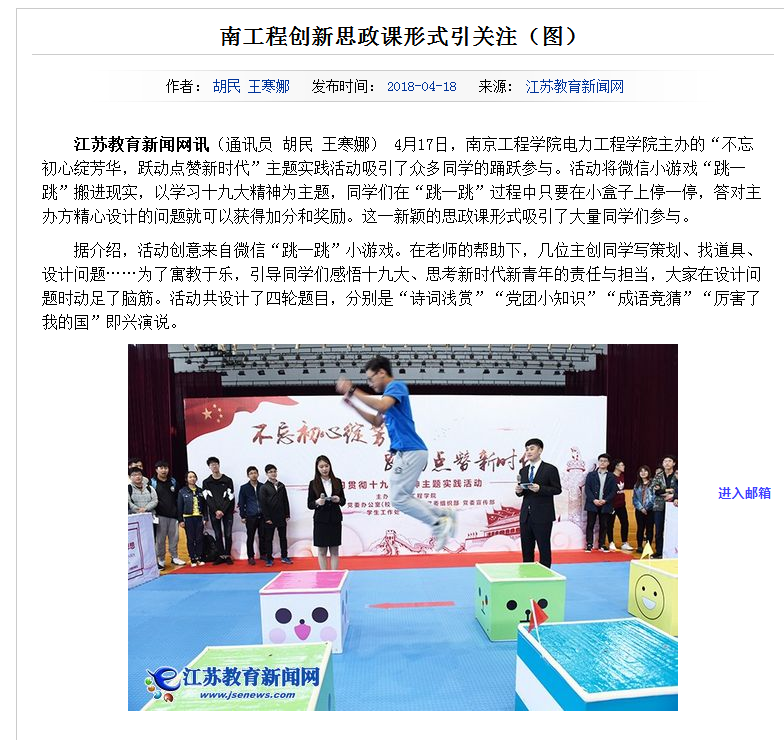 江苏教育新闻网讯(通讯员 胡民 王寒娜) 4月17日,beat365官方网站电力工程学院主办的“不忘初心绽芳华,跃动点赞新时代”主题实践活动吸引了众多同学的踊跃参与。活动将微信小游戏“跳一跳”搬进现实,以学习十九大精神为主题,同学们在“跳一跳”过程中只要在小盒子上停一停,答对主办方精心设计的问题就可以获得加分和奖励。这一新颖的思政课形式吸引了大量同学们参与。
