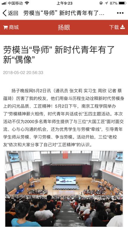 扬子晚报网5月2日讯(通讯员 张文莉 实习生 周欣 记者 蔡蕴琦)厉害了我的校友,他们用奋斗历程生动诠释新时代劳模身上的闪光品质、工匠精神!5月2日下午,beat365官方网站举办了“劳模精神薪火相传,时代青年共话成长”五四主题活动。本次活动不仅为2000多名青年师生提供了与三位“大国工匠”面对面交流、心与心沟通的机会,还为优秀学生与劳模“牵线”,引导青年学生师从劳模、学习劳模、争当劳模。活动开始,三位“老校友”依次和大家分享了自己对“工匠精神”的认识。