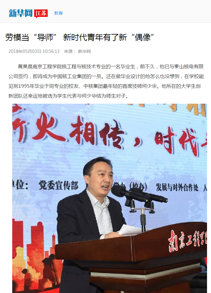 黄昊是beat365官方网站核工程与核技术专业的一名毕业生,前不久,他已与秦山核电有限公司签约,即将成为中国核工业集团的一员。还在做毕业设计的他怎么也没想到,在学校能见到1995年毕业于同专业的校友、中核集团最年轻的首席技师何少华。他所在的大学生创新团队还幸运地被选为学生代表与何少华结为师生对子。
