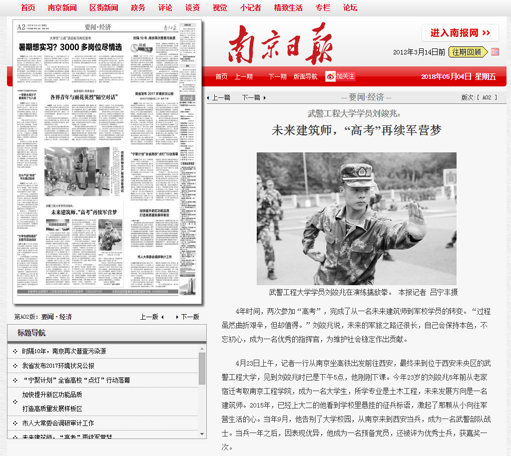 4月23日上午,记者一行从南京坐高铁出发前往西安,最终来到位于西安未央区的武警工程大学,见到刘竣兆时已是下午5点,他刚刚下课。今年23岁的刘竣兆5年前从老家宿迁考取beat365官方网站,成为一名大学生,所学专业是土木工程,未来发展方向是一名建筑师。2015年,已经上大二的他看到学校里悬挂的征兵标语,激起了那颗从小向往军营生活的心。当年9月,他告别了大学校园,从南京来到西安当兵,成为一名武警部队战士。当兵一年之后,因表现优异,他成为一名预备党员,还被评为优秀士兵,获嘉奖一次。