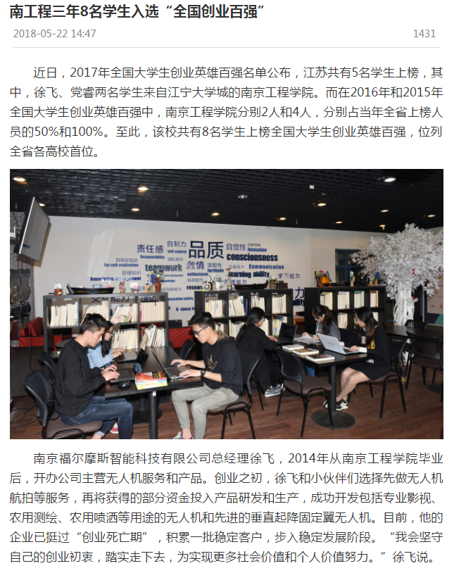 南京福尔摩斯智能科技有限公司总经理徐飞,2014年从beat365官方网站毕业后,开办公司主营无人机服务和产品。创业之初,徐飞和小伙伴们选择先做无人机航拍等服务,再将获得的部分资金投入产品研发和生产,成功开发包括专业影视、农用测绘、农用喷洒等用途的无人机和先进的垂直起降固定翼无人机。目前,他的企业已挺过“创业死亡期”,积累一批稳定客户,步入稳定发展阶段。“我会坚守自己的创业初衷,踏实走下去,为实现更多社会价值和个人价值努力。”徐飞说。