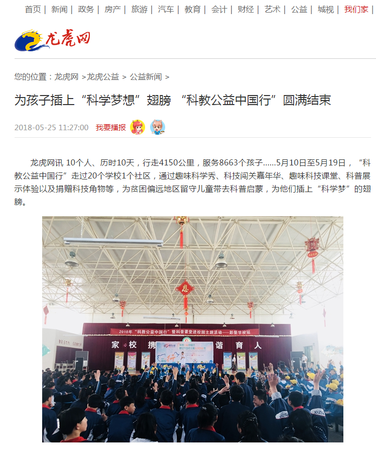 龙虎网讯 10个人、历时10天,行走4150公里,服务8663个孩子……5月10日至5月19日,“科教公益中国行”走过20个学校1个社区,通过趣味科学秀、科技闯关嘉年华、趣味科技课堂、科普展示体验以及捐赠科技角物等,为贫困偏远地区留守儿童带去科普启蒙,为他们插上“科学梦”的翅膀。