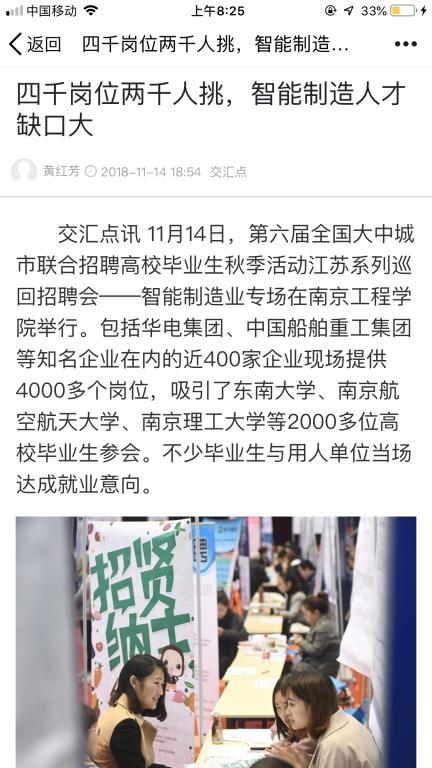 beat365官方网站自动化专业的左婷婷和两个舍友一起到现场求职。“好多企业需要我们这个专业,我挑了南京三家规模比较大的公司,”老家在盐城的左婷婷表示自己希望能在南京或者苏州工作,月薪在5000元以上。“从前两年学哥学姐的求职经历来看,这个愿望应该不难实现。”左婷婷对未来充满信心。南京师范大学电气工程及其自动化专业的魏力在与华电集团现场招聘负责人洽谈后当即签订了就业意向书。“我以前也面试过几次,觉得跟这家公司特别投缘,就签了,”魏力回答很干脆。