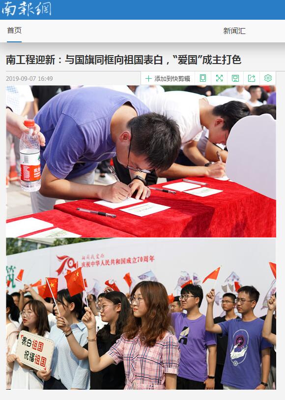综合楼广场每年都是新生报到最热闹的地方,LED屏上滚动播出的南工程师生共唱“我和我的祖国”的歌舞快闪视频和“我爱你 祖国”的海报深深吸引新生们驻足,他们纷纷挥舞五星红旗,在签名墙前与国旗留下最庄重而神圣的合影。