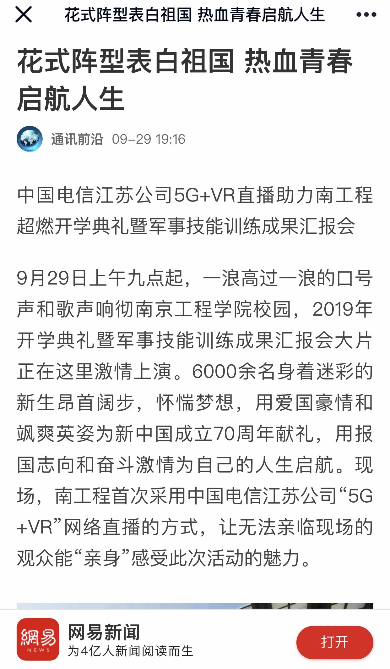 5G,是引领未来生活的先进技术。在本次的开学典礼暨军事技能训练成果汇报会上,天翼智慧家庭科技有限公司利用自身优势和中国电信江苏公司联合完成了此次5G+VR全景直播,打造炫酷的视觉盛宴,让观众足不出户也可感受到多维度、个性化、零距离的直播体验。