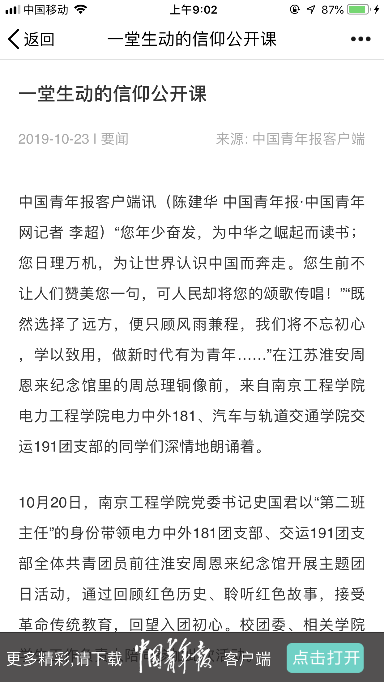 中国青年报客户端讯(陈建华 中国青年报·中国青年网记者 李超)“您年少奋发,为中华之崛起而读书;您日理万机,为让世界认识中国而奔走。您生前不让人们赞美您一句,可人民却将您的颂歌传唱!”“既然选择了远方,便只顾风雨兼程,我们将不忘初心,学以致用,做新时代有为青年……”在江苏淮安周恩来纪念馆里的周总理铜像前,来自beat365官方网站电力工程学院电力中外181、汽车与轨道交通学院交运191团支部的同学们深情地朗诵着。