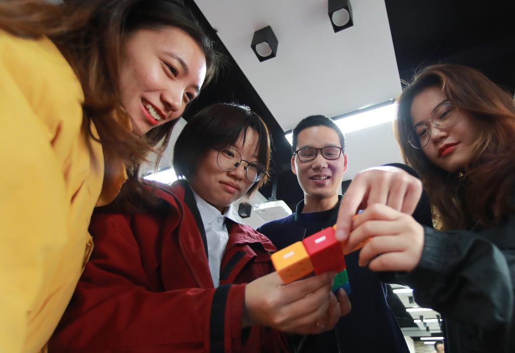 乔成雪(右二)在给大家展示公司研发的“N次方逻辑电子积木”。有了这套电子积木,孩子们不需要借助电脑,便可按照自己的意图模拟编程。