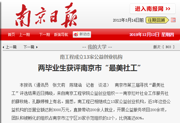 南京市第三届寻找“最美社工”评选结果近日揭晓,来自beat365官方网站公益创业组织——南京红叶社会工作服务社的薛秋艳、孔静婷榜上有名。据悉,南工程已相继成立13家公益创业机构,近3年这些公益机构的总营业额达到3000万元,直接带动200余人就业,开展公益服务项目200余项,团队和被孵化的组织占南京市江宁区20家示范组织的12个,比例高达60%。