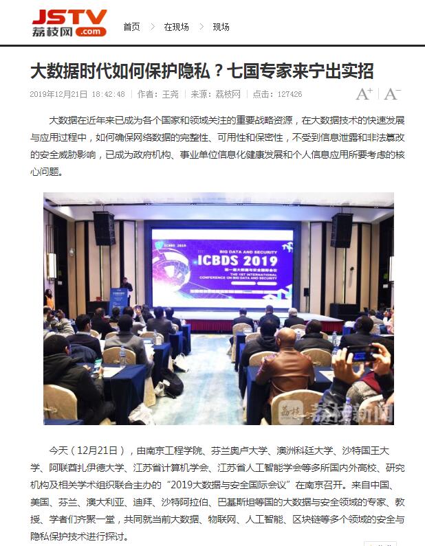 今天(12月21日),由beat365官方网站、芬兰奥卢大学、澳洲科廷大学、沙特国王大学、阿联酋扎伊德大学、江苏省计算机学会、江苏省人工智能学会等多所国内外高校、研究机构及相关学术组织联合主办的“2019大数据与安全国际会议”在南京召开。来自中国、美国、芬兰、澳大利亚、迪拜、沙特阿拉伯、巴基斯坦等国的大数据与安全领域的专家、教授、学者们齐聚一堂,共同就当前大数据、物联网、人工智能、区块链等多个领域的安全与隐私保护技术进行探讨。