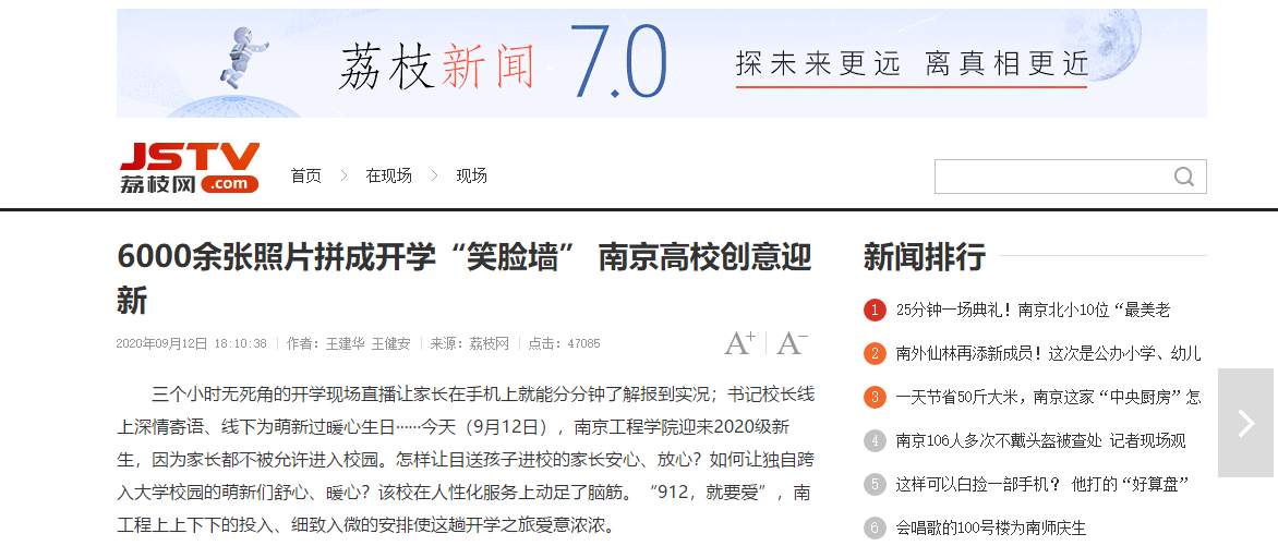独立报到,是精彩大学生活的开场,校门口则成了新生与家长告别的地方。为了给新生和家长留下难忘的记忆,校门前,学校专门立起了大大的“笑脸墙”,“笑脸墙”是由2020级新生的照片组成“I❤NJIT”的字样。一早就有家长在这里找自己孩子的照片,与即将入校的孩子合影。墙上一张张笑脸,墙前一个个拥抱,绘成这个初秋最温暖、最动人的画面。