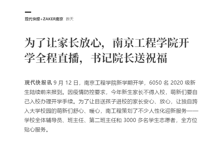 开学前一天,所有新生和家长都收到了 " 欢迎来到南工程大家庭 " 的直播预告。" 现在我们的新生正在使用‘今日校园’ App 扫描二维码,确认体温正常后方可进入校园。" 报到当天上午,手机直播平台里传来了主播的声音," 已经有同学乘坐上了一早就守候在这里的小公交,可以看到志愿者们正在帮忙搬运行李,小公交将把他们送至宿舍区 ……" 从入校到去宿舍送行李,再到学院报到处走完报至流程,数台摄像机、无人机的跟拍,让零距离、无死角的直播模式直观又暖心。" 我们在画面中看到,已经有家长陆续来到了校门外,目送孩子进入校园,殷殷期盼与依依不舍,我们隔着画面都已经感受到了。" 不少家长留言。