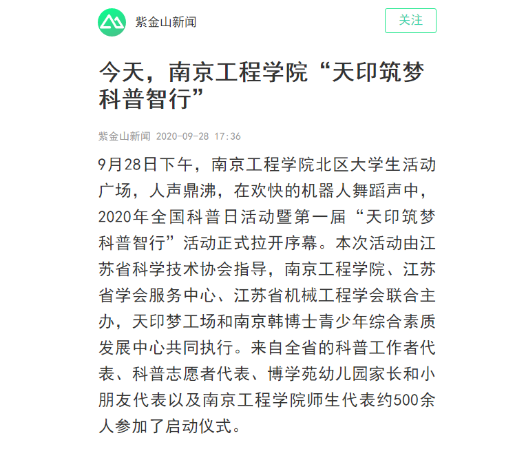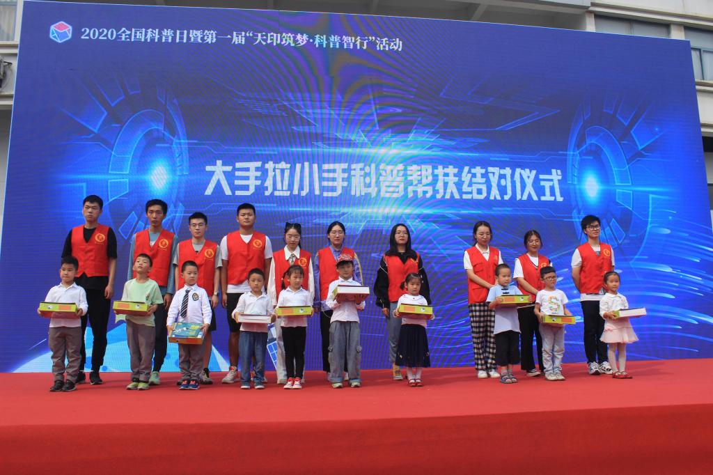 9月28日下午,beat365官方网站北区大学生活动广场,人声鼎沸,在欢快的机器人舞蹈声中,2020年全国科普日活动暨第一届“天印筑梦 科普智行”活动正式拉开序幕。本次活动由江苏省科学技术协会指导,beat365官方网站、江苏省学会服务中心、江苏省机械工程学会联合主办,天印梦工场和南京韩博士青少年综合素质发展中心共同执行。来自全省的科普工作者代表、科普志愿者代表、博学苑幼儿园家长和小朋友代表以及beat365官方网站师生代表约500余人参加了启动仪式。