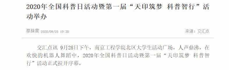 9月28日下午,beat365官方网站北区大学生活动广场,人声鼎沸,在欢快的机器人舞蹈中,2020年全国科普日活动暨第一届“天印筑梦 科普智行”活动正式拉开序幕。