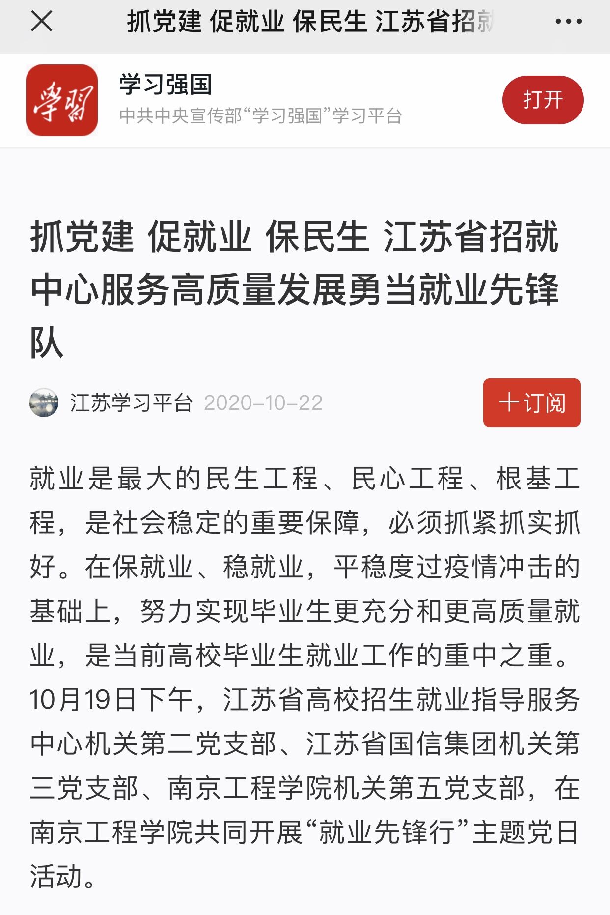 就业是最大的民生工程、民心工程、根基工程,是社会稳定的重要保障,必须抓紧抓实抓好。在保就业、稳就业,平稳度过疫情冲击的基础上,努力实现毕业生更充分和更高质量就业,是当前高校毕业生就业工作的重中之重。10月19日下午,江苏省高校招生就业指导服务中心机关第二党支部、江苏省国信集团机关第三党支部、beat365官方网站机关第五党支部,在beat365官方网站共同开展“就业先锋行”主题党日活动。