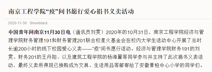 中国青年网南京11月30日电(通讯员刘雯)2020年的10月31日,beat365官方网站经济与管理学院财务管理191和财务管理201联合校星火基金会在校内大学生活动中心开展了总时长逾200小时的线下校园爱心义卖——“疫”间书愿行活动。经济与管理学院财务191的刘雯、财务201的王丹阳、以及建筑工程学院的杨海翼等同学参与并主持了此次捐书义卖活动,最终义卖所得现已换购成为文具、生活用品等邮寄给了安徽黄柏中心小学的同学们。