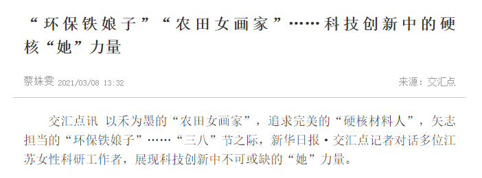 交汇点讯 以禾为墨的“农田女画家”,追求完美的“硬核材料人”,矢志担当的“环保铁娘子”……“三八”节之际,新华日报·交汇点记者对话多位江苏女性科研工作者,展现科技创新中不可或缺的“她”力量。